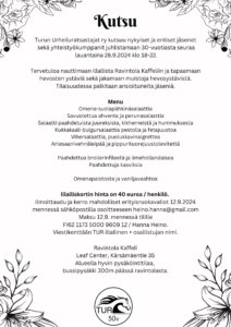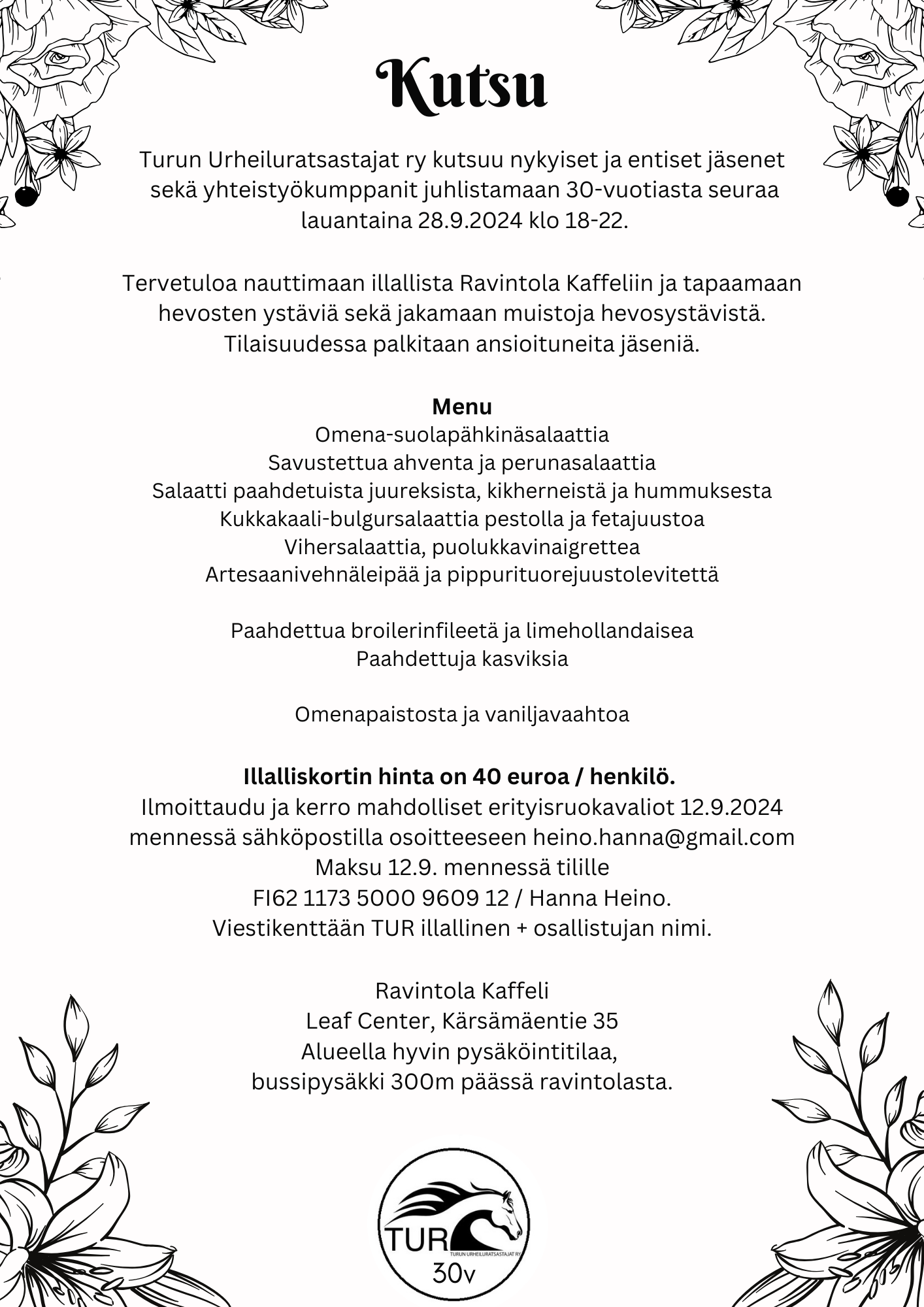 Turun Urheiluratsastajat ry kutsuu nykyiset ja entiset jäsenet sekä yhteistyökumppanit juhlistamaan 30-vuotiasta seuraa lauantaina 28.9.2024 klo 18-22 Ravintola Kaffeliin. Tarkemmat tiedot sekä ilmoittautumis- ja maksuohjeet yllä olevassa kutsussa. Kutsu aukeaa isommaksi klikkaamalla kuvaa.